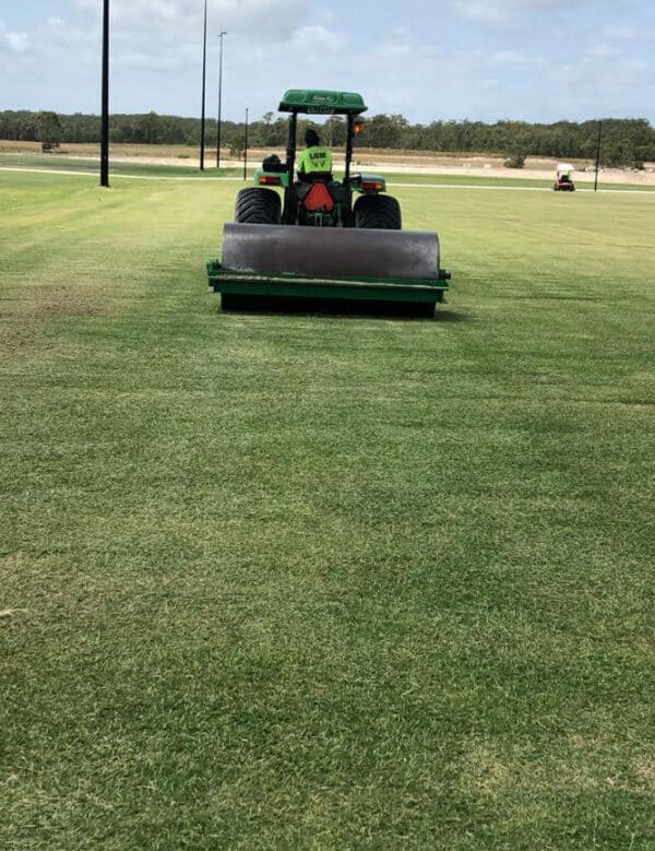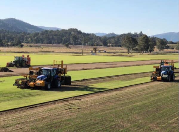The turf was installed in a 10 week period with an average of 3,000m2 per day. We would keep 2 low ground pressure floatation tractors onsite at install stage 1 was fitted with a levelling bar to keep areas all prepared and this tractor would also tow the smooth drum roller at the end of each day. The second tractor would service as our haul out tractor to layout the pallets of turf for our installers. We have a policy of not having Moffett forklifts on the prepared sportsfield areas so not to damage the fields.