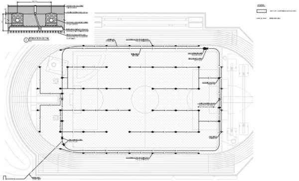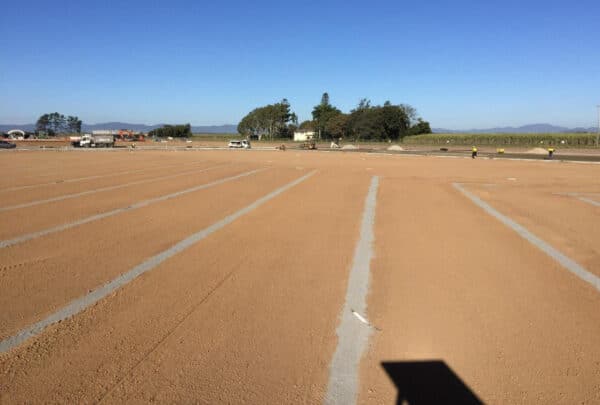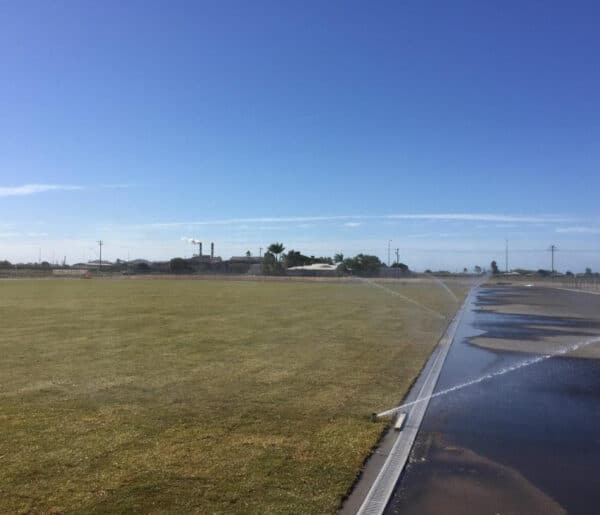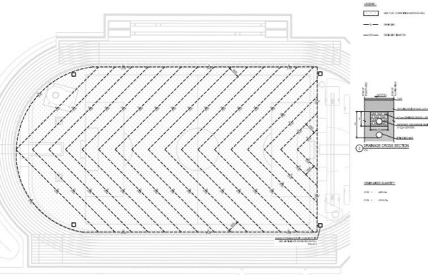 The Mackay council had only specified one part of the field build (the rest being entirely left to Hanceys knowledge and expertise) and that was requiring the field be as flat as possible as it was predominantly to be an athletics infield. This meant that the drainage design involved calculations based on required drainage rates versus a fall of only 0.5% (as opposed to the usual sportsfield build of 1% falls.). It was decided therefore that drainage spacing be at 5m centres using 100mm agi pipe falling into a 150mm collector pipe around the field perimeter. These 150mm collector drains then feed into four stormwater pits at each corner of the field, and away offsite into the local water courses. Also, a drainage system was designed that resembled one large herringbone, as opposed to the normal grid system drainage designed by Hanceys turf on other sports fields; implemented to catch as much rainfall as possible in the most efficient way.