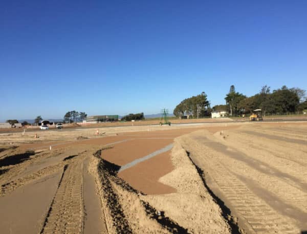Hanceys arrived onsite mid May and had been handed a sub grade by the civil contractors which was 200mm below finished height, shaped at 0.5% falls from centre to touchline. The first job on the specification was to rip and amend the subgrade with Gypsum and lime to aide root growth and drainage, before laser grading with falls to +/- 10mm. Once this was completed we could now begin installing the new irrigation system. Pipes were trenched in at 400mm below subgrade height to allow for the drainage pipes to cross over and above them at numerous points. Once fully installed and connected, the elbows where sprinkler heads would screw on were instead capped to avoid damage or crushed during the next phase of works. GPS plotting these locations proved to save a lot of time (and digging) at a later stage. All piping was sand back filled, for protection of the pipes and ease of any future maintenance requirements.