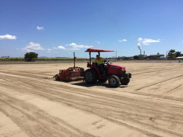 With this stage of works complete importing of the rootzone layer could begin. Hanceys turf sourced the sand material from the ‘Mackay sand and gravel’ company’s quarry in North Mackay. Having looked at several options for this key component of the build, Mark P chose to use local products after inspecting and testing the sand for various reasons; Firstly: cost – obviously trucking materials from our regular suppliers in Brisbane would prove far too expensive and exceed the clients budget, secondly: quality – after samples were taken and sent to Groundscience labs in Melbourne, results showed a high quality, consistent and clean material which reached both percolation rate requirements and moisture retention ability due to correct particle size distribution. Matt Roche, the turf consultant, added his amendment recommendations to provide a great growing medium for the turf, (various amendments were added to what was essentially a raw product including calcium for salt reduction, amendmax to add organic content and wetting agents). Thirdly: using a local product meant that our client could easily and cost effectively source the exact same material in future for top dressing and maintenance as and when it is required. Mixing of materials is never recommended by Hanceys as it can create a layering effect throughout the rootzone).