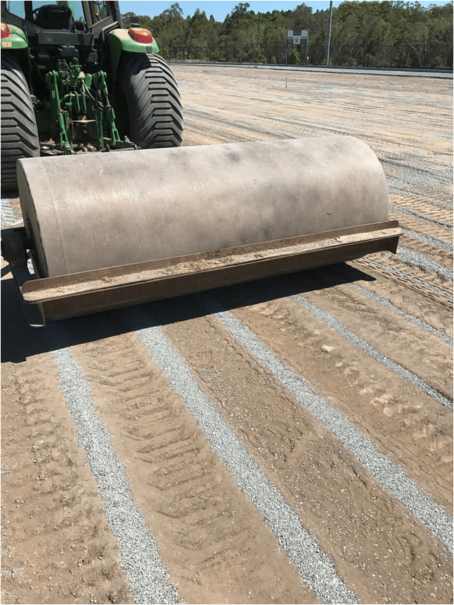 The consultant’s specifications were to remove 200mm of existing site soil, level this new subgrade, install a new irrigation system connected to the old main inlet and pump system. The drainage system specified for 100mm agi pipes in trenches at 300mm below finished subgrade heights east to west across the field and topped up to subgrade level with 5mm gravel all on a 1% fall to an outer 150mm ring main drain. Hanceys then installed gravel bands North to south along the field 500mm apart at a depth of 200mm to connect all the sub surface drains, using Hanceys Koro top drain gravel/sand banding machine. This machine can be set at various depths to a maximum of 250mm, creates 50mm wide slits, removes spoil and back fills with specified material and compacts the trench all in one pass, 3 trenches at a time.