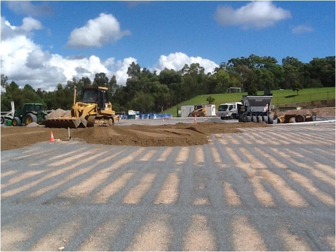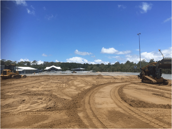 With this stage of works complete importing of the rootzone layer could begin. Truck and dogs brought the 3000tonnes of pro2 blend sand material from the Riversands quarry at Carbrook but they obviously couldn’t drive on the subgrade and damage the drainage so dropped material on the edge of the field where a D6 Drott (set on the correct levels using a total station) created a pad and pushed the sand out from there. A possi track bobcat with laser levelling blade was then used to final trim the field before turfing.
